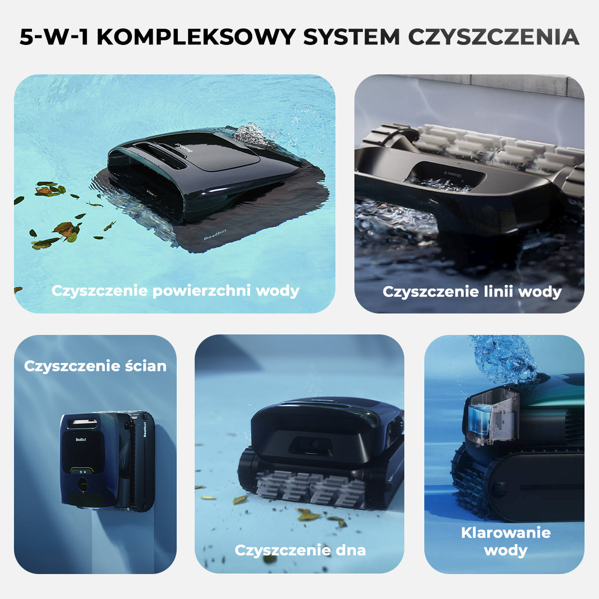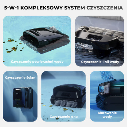 - 5 w 1 Czyszczenie: Powierzchnia wody, Linia wody, Podłoga, Ściany, Klarowanie wody