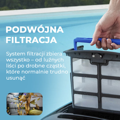 - Pełny cykl czyszczenia 5 w 1: usuwa zanieczyszczenia z powierzchni wody, czyści linię wodną, podłoże, ściany i dodatkowo filtruje wodę.