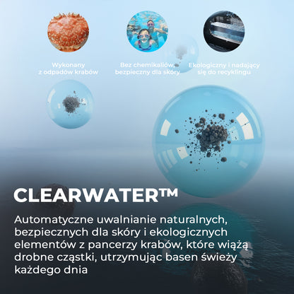 Pływanie w basenie to przyjemność, a nie laboratorium chemiczne. Technologia ClearWater™ delikatnie oczyszcza wodę bez agresywnych środków chemicznych, dzięki czemu możesz zapomnieć o podrażnieniach skóry czy nieprzyjemnym zapachu chloru. Jest to szczególnie ważne, jeśli dzieci lubią pluskać się w basenie – żadnych zaczerwienionych oczu i suchej skóry, tylko czysta, świeża woda, która sprawia, że chce się w niej pływać raz po raz.
