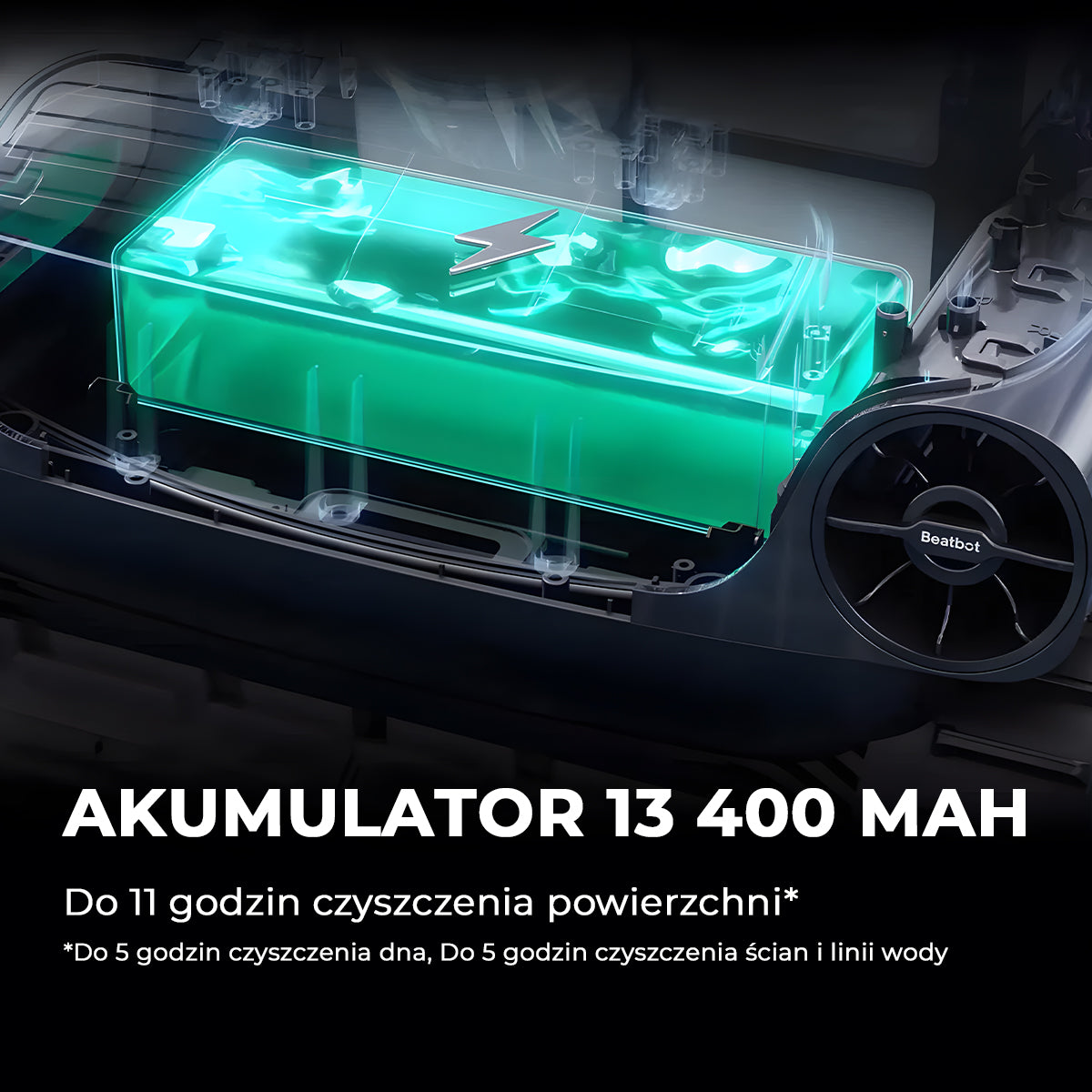 Zapomnij o częstym ładowaniu – robot działa do 11 godzin bez przerwy. Dzięki mocnej baterii o pojemności 13 400 mAh przejedzie po całym basenie, nie zostawiając ani odrobiny brudu. Nawet jeśli masz duży basen, Beatbot AquaSense 2 Pro wykona zadanie na jednym ładowaniu, a Ty nie będziesz musiał myśleć o ładowaniu co kilka godzin.